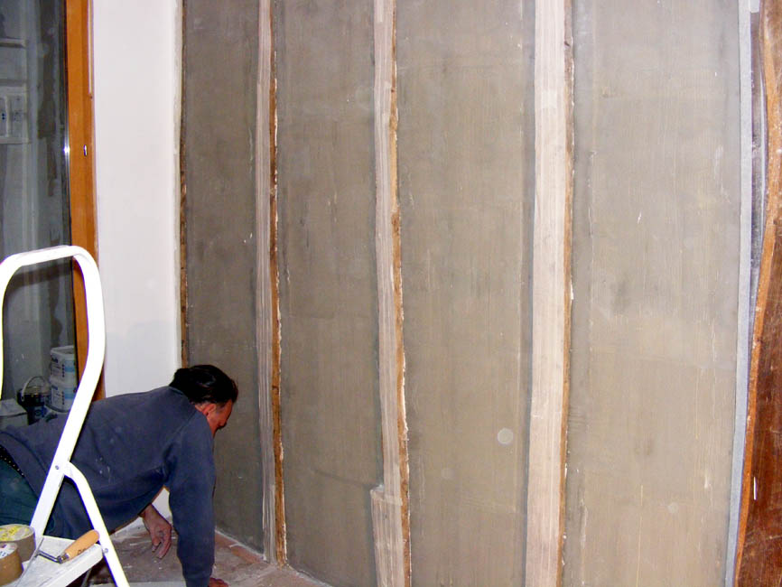 Painting is happening - the entry hall has been chaux-chanvre'd, so that, the dining room, the small (downstairs) toilet and the ceiling above the stairs are in the process of being painted. Once the ceiling above the stairs has been painted we can sand and varnish the staircase.Stéphane finishing the chaux-chanvre in the entry hall