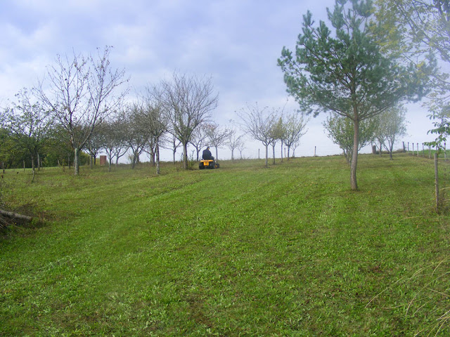 I called them up a couple of weeks ago and we met at the orchard to discuss the work. It was agreed they would come on 18 October and get as much done in a day as they could, for their standard daily rate of €240 + TVA. We all hoped it wouldn't pour with rain, but they assured me that if it was just damp with a few sprinkles they would work through it. Luck was with us, and although cloudy, the temperature got up to the low 20s and we had to shed a layer of clothing by lunchtime. (And it's rained pretty well non-stop the following days.)