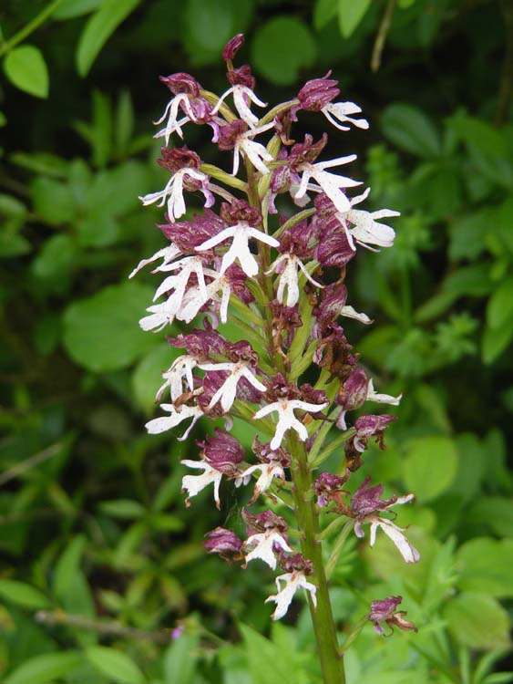 The Lady Orchid Orchis purpurea (Fr. Orchis pourpre) is easy to recognise. It's large and pretty, making it easy to spot in the grass. When you look closer though you realise that the individual flowers vary considerably from plant to plant. This is partly because the species hybridises very easily with other Orchis spp, so often what you are looking at is not 100% Lady Orchid, but a mixture (of Lady and Monkey usually, which is so common it even has a name). Each flower spike is usually made up of 40-60 individual flowers, but can be as many as 200 flowers.