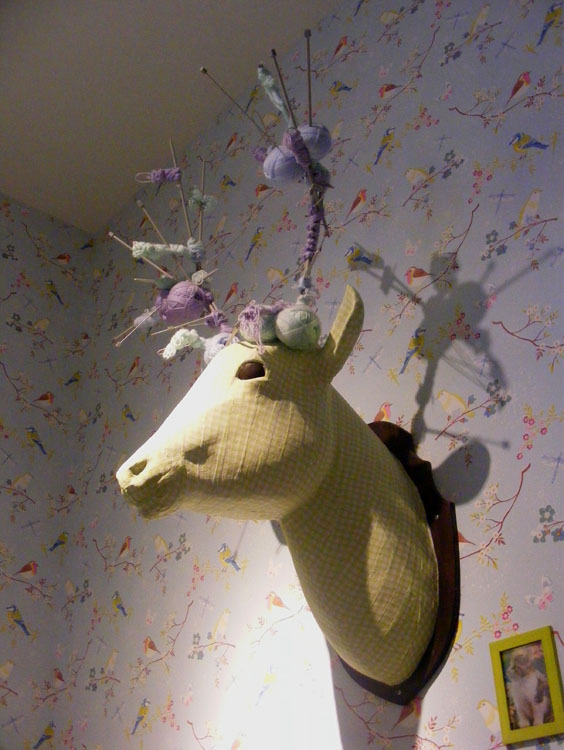 A red deer taxidermy form wrapped in gingham and given knitting needle antlers.
